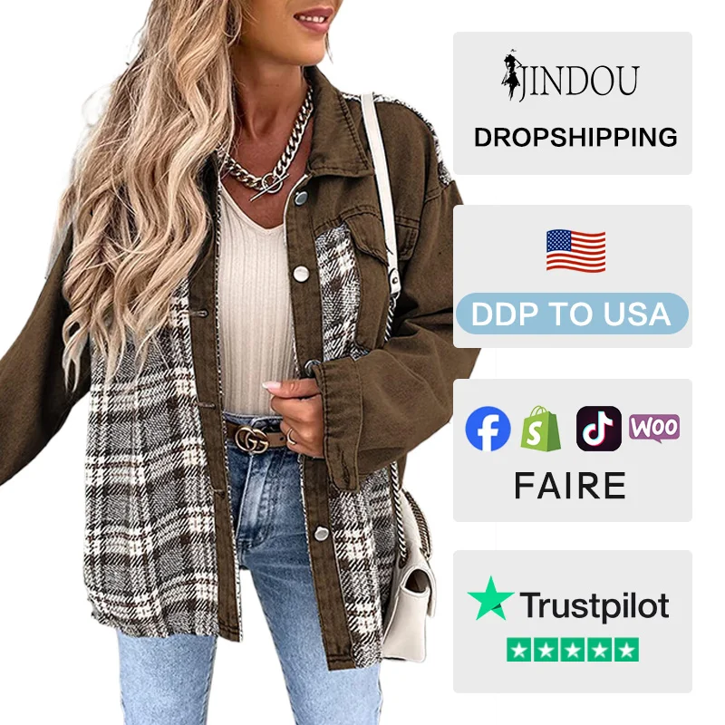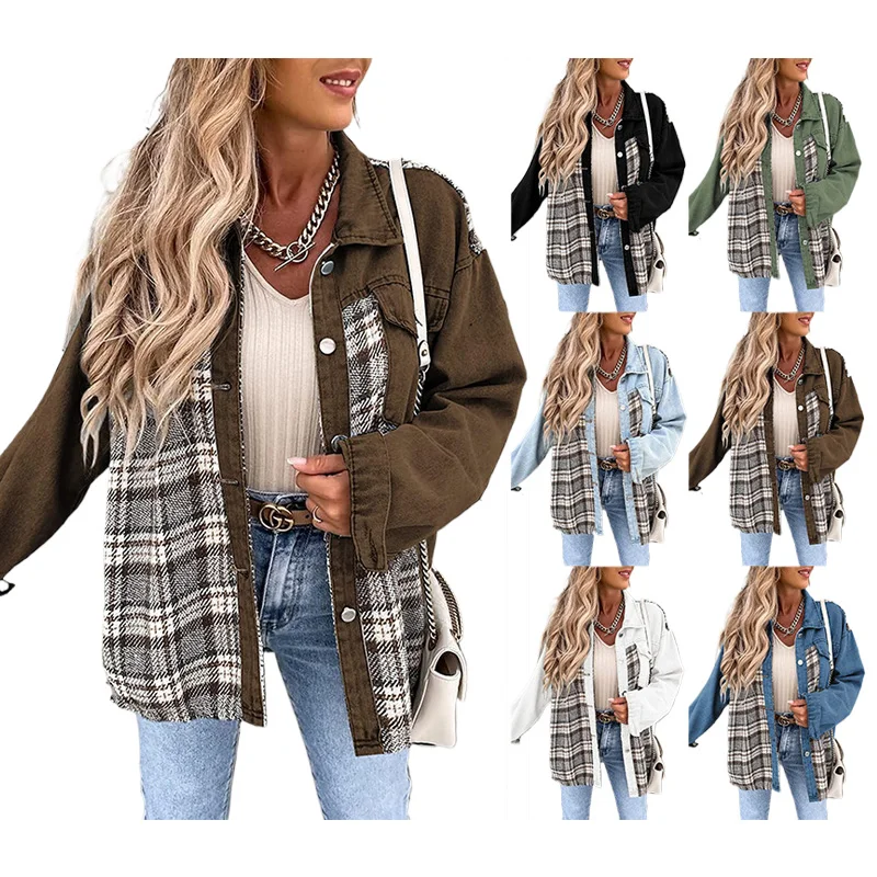 2026 Fashion Casual Plaid Denim Jean Patchwork Chaquetas Vaqueras Shirt Jacket for Women Button Trendy Jackets